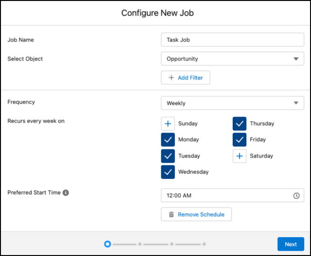 - Tiene un caso de uso empresarial para crear tareas para oportunidades abiertas para las que la fecha de cierre es inferior a una semana.