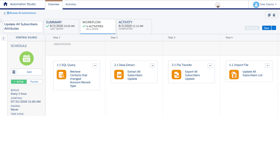4) El cuarto paso importa las importaciones de los datos actualizados en el registro de suscriptores de Marketing Cloud en la Lista de todos los suscriptores. ¡Viva! Para ello utilizamos la actividad Importar archivo.