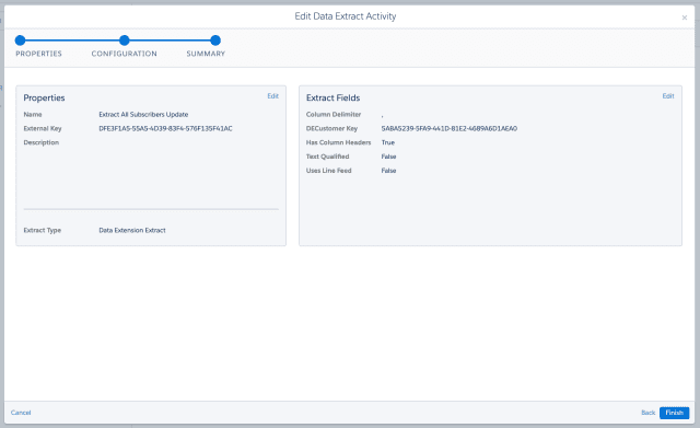2) El segundo paso extrae registros de la extensión de datos temporal que creamos anteriormente. Aquí utilizamos un tipo de actividad Extracción de datos.
