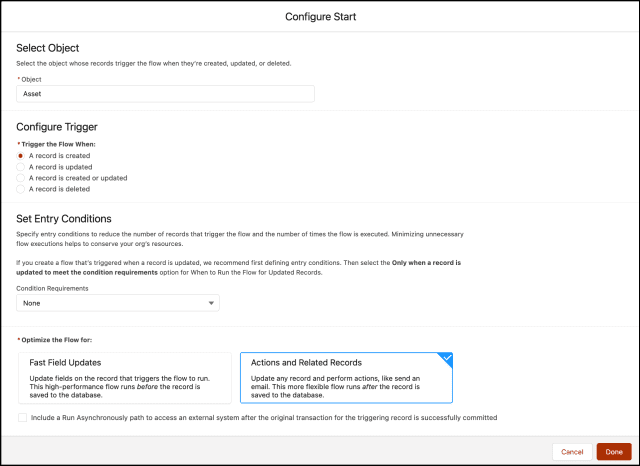 A medida que nos estamos alejando de la Regla de flujo de trabajo y el Generador de procesos , Corey debería usar Salesforce Flow. Para resolver este requisito, utilizaremos el Flujo desencadenado por registro después de guardar . Consulte este artículo para comprender por qué estamos utilizando el flujo desencadenado por registro posterior al guardado para este escenario.