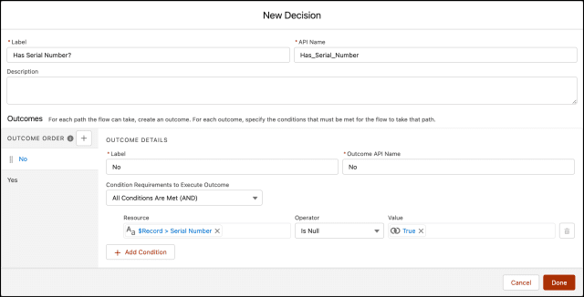 - Agregue un elemento de Decisión para verificar si el campo Número de serie está en blanco