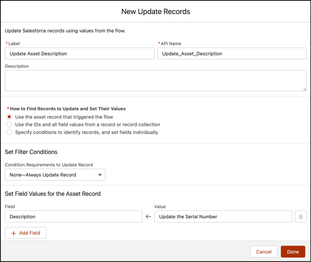 - Agregue un elemento Actualizar registros para actualizar la descripción del activo