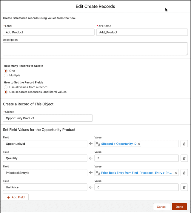 - Agregue un elemento de creación de registros para agregar un producto a la oportunidad