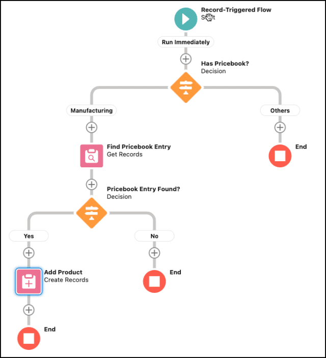 - Usar el generador de flujo de Salesforce para asignar automáticamente el producto a una oportunidad