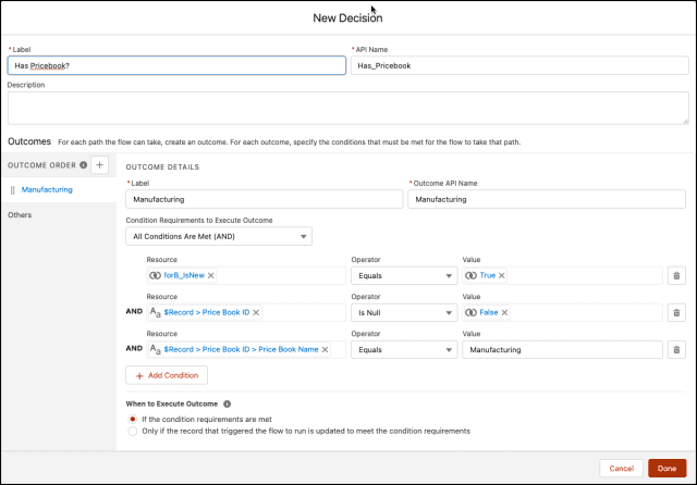 Ahora usaremos el elemento Decisión para verificar si el libro de precios de fabricación está asociado a una oportunidad.
