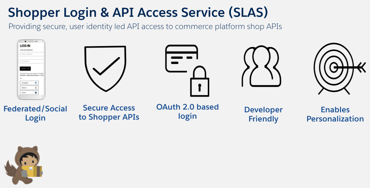 Esta API y servicio es una solución de autenticación y autorización a gran escala que brinda acceso seguro a las API de Shopper de la plataforma Commerce. Permite a los comerciantes desarrollar una funcionalidad que permite a los compradores iniciar sesión a través de la federación en un proveedor de identidad (IdP) de su elección. Es fundamental para SLAS la introducción de las API de inicio de sesión basadas en OAuth 2.0, que utilizan el refresh-token para permitir que un comprador inicie sesión una vez y conserve el inicio de sesión hasta por 90 días.