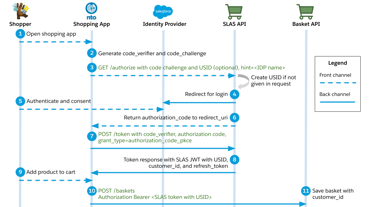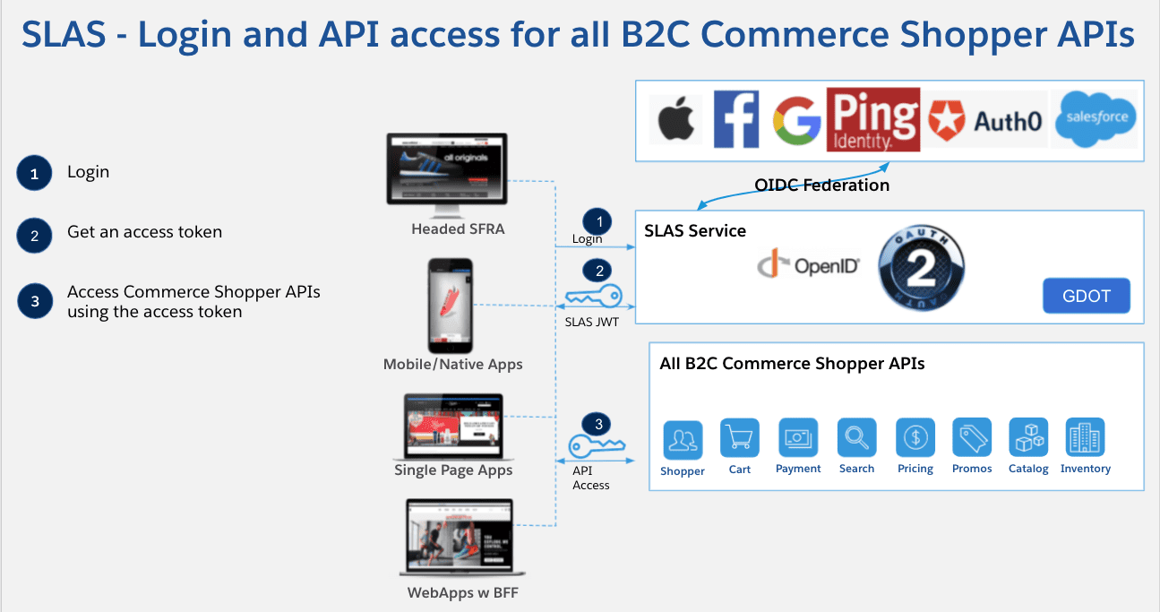 SLAS proporciona inicio de sesión a gran escala y acceso a la API para una amplia variedad de aplicaciones sin periféricos. Este es típicamente un proceso de tres pasos: