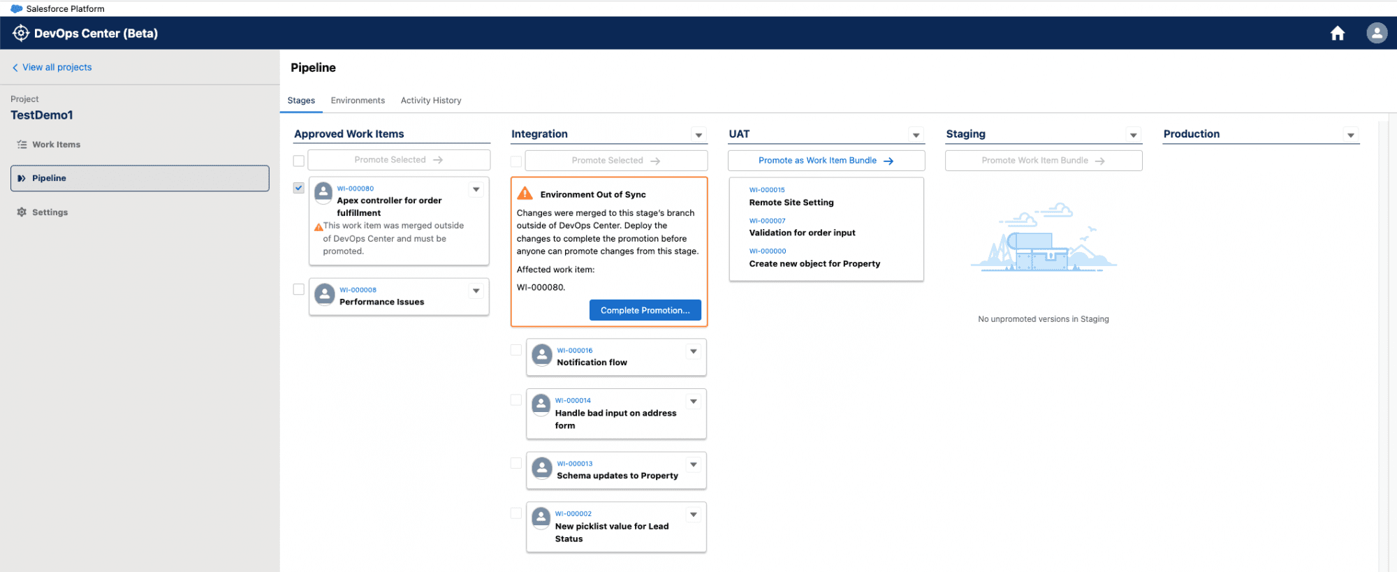 Ahora, en DevOps Center, el equipo puede ver que los cambios se fusionaron "externamente" o desde fuera de DevOps Center. Y dado que el paso Promoción en DevOps Center realiza tanto la fusión como la implementación, debido a que el elemento de trabajo ahora se ha fusionado, le dice al usuario que los cambios ahora deben implementarse para mantener la rama de integración y la organización sincronizadas entre sí.