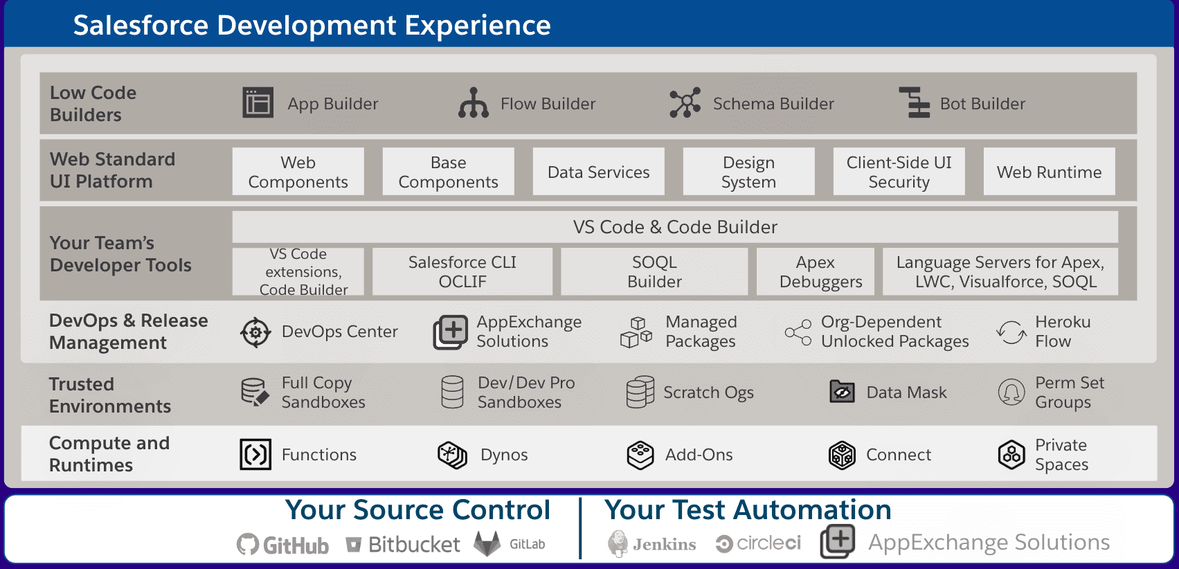 Herramientas sin código: las herramientas sin código vienen listas para usar dentro del entorno de Salesforce. Los desarrolladores usan estas herramientas para crear modelos de datos de aplicaciones (Schema Builder), configurar la seguridad de los datos, escribir automatización sin código y mucho más.