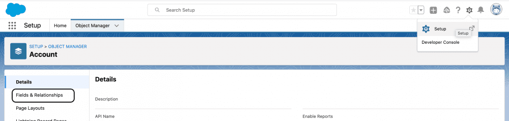 - Busque los nombres de API de campo y objeto navegando a lo siguiente: URL de instancia de organización -> Configuración -> Administrador de objetos -> Campo y relaciones.