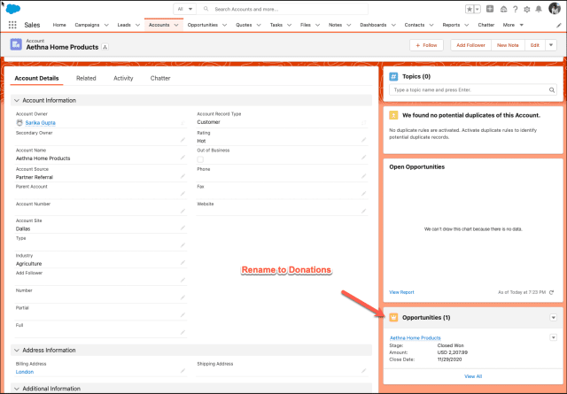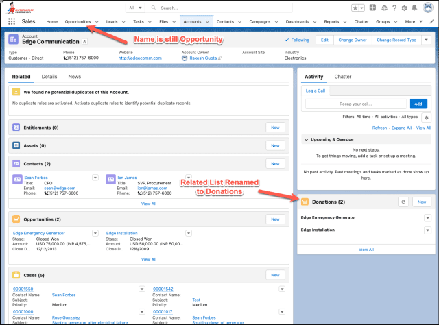 Tomemos otro escenario en el que el equipo de ventas solo quiere cambiar el nombre de la lista relacionada de Oportunidad en Cuenta sin cambiar el nombre de la pestaña Oportunidad (y la lista relacionada de Oportunidad en cualquier página).