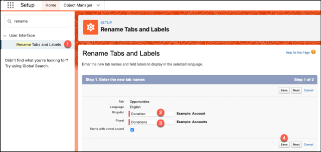 Otro ejemplo es cambiar el nombre de la lista relacionada Oportunidades a Donaciones .