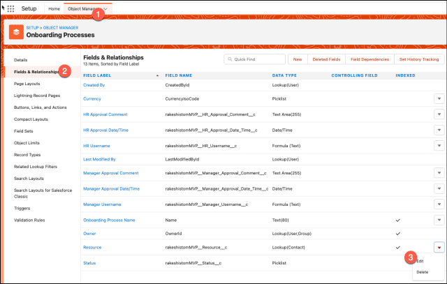 - Vaya a Configuración | Administrador de objetos | Proceso de incorporación | Campos y relaciones .