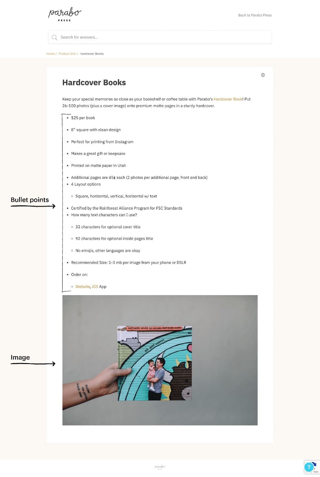 Parabo Press utiliza viñetas e imágenes para explicar una de sus ofertas de productos.