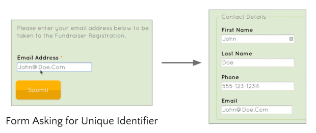 Por ejemplo, puede solicitar el nombre y la dirección de un donante en varios lugares o en páginas separadas del formulario. Al rellenar previamente de una sección del formulario a otra, los usuarios no experimentan la molestia de escribir repetidamente la misma información en varios campos.