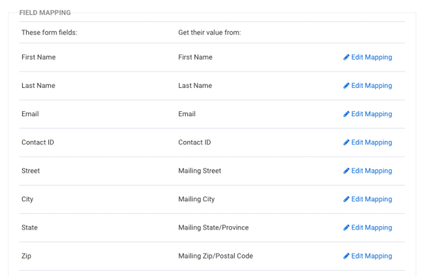 En la captura de pantalla a continuación, puede ver que con la asignación de campos, ciertos campos de formulario reciben su valor de registros específicos alojados en Salesforce. Cuando se mapean correctamente, los campos se rellenarán automáticamente una vez que el encuestado haga clic en su enlace único.