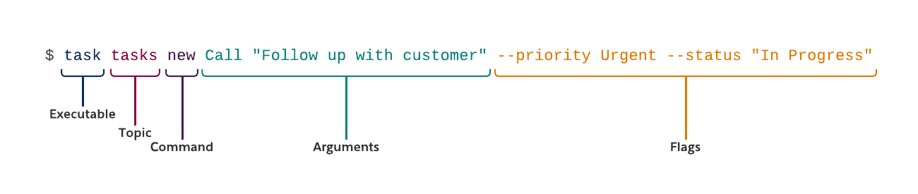 Antes de construir nuestra aplicación CLI, veamos exactamente qué construiremos. Digamos que queremos construir un comando para crear tareas de Salesforce. Este comando almacenará tareas localmente y proporcionará un subcomando para sincronizar tareas locales con tareas remotas en Salesforce, lo que significa enviar tareas locales no sincronizadas y extraer tareas remotas.