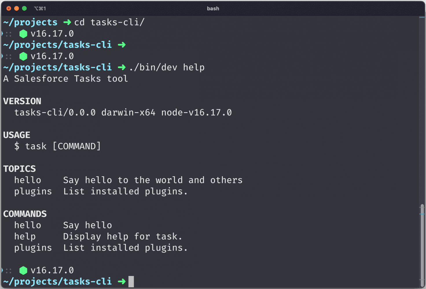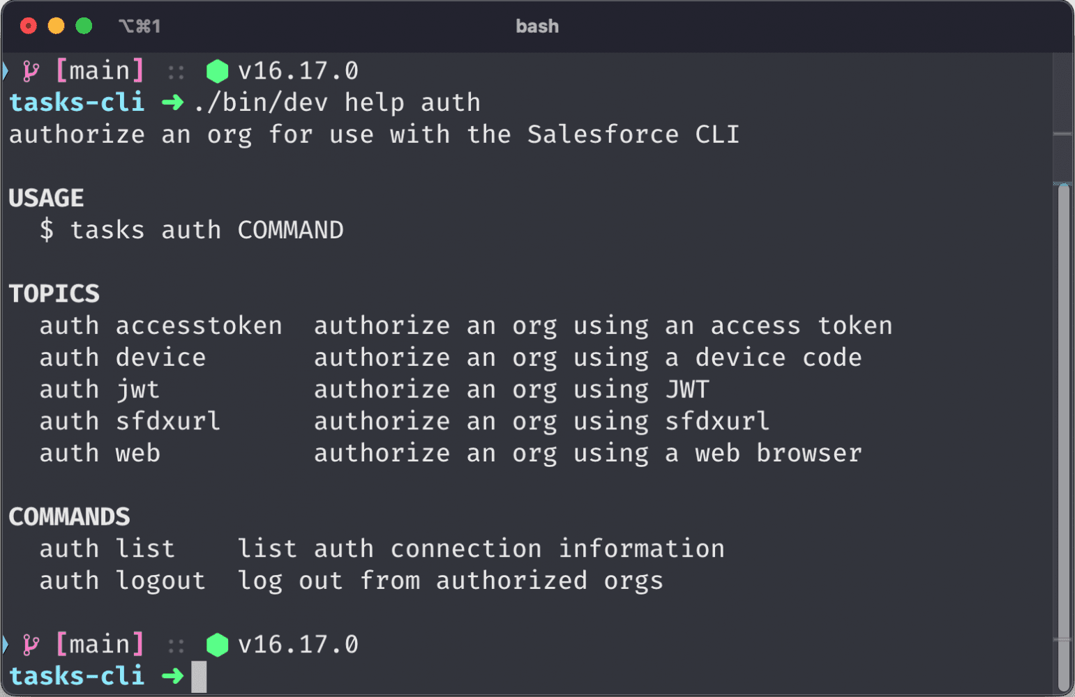 Una de las principales ventajas que tiene oclf es su capacidad de complemento. No solo podrá escribir complementos para sus aplicaciones, sino también usar complementos publicados por otros. Para nuestra aplicación de tasks , usaremos @salesforce/plugin-auth para permitir que nuestra aplicación se autentique en una organización de Salesforce; este complemento es el mismo que usa la CLI de sfdx .