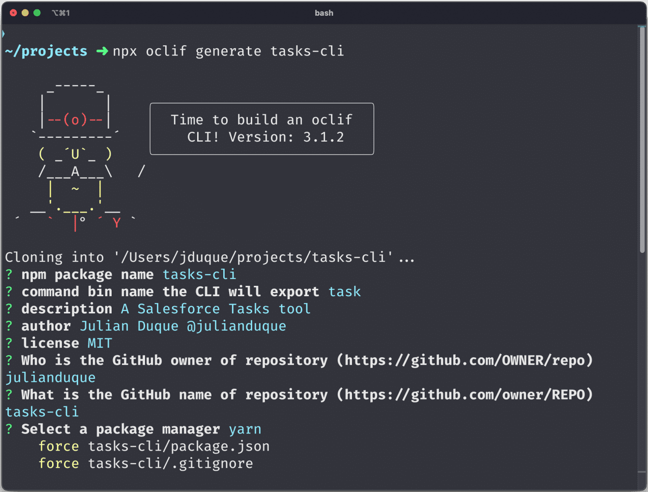 oclf viene con un generador de proyectos que creará un andamiaje con lo que se necesita para comenzar a crear una aplicación CLI. Creará un proyecto Node.js compatible con TypeScript y un útil comando "hola mundo" para mostrarle cómo funciona un comando.
