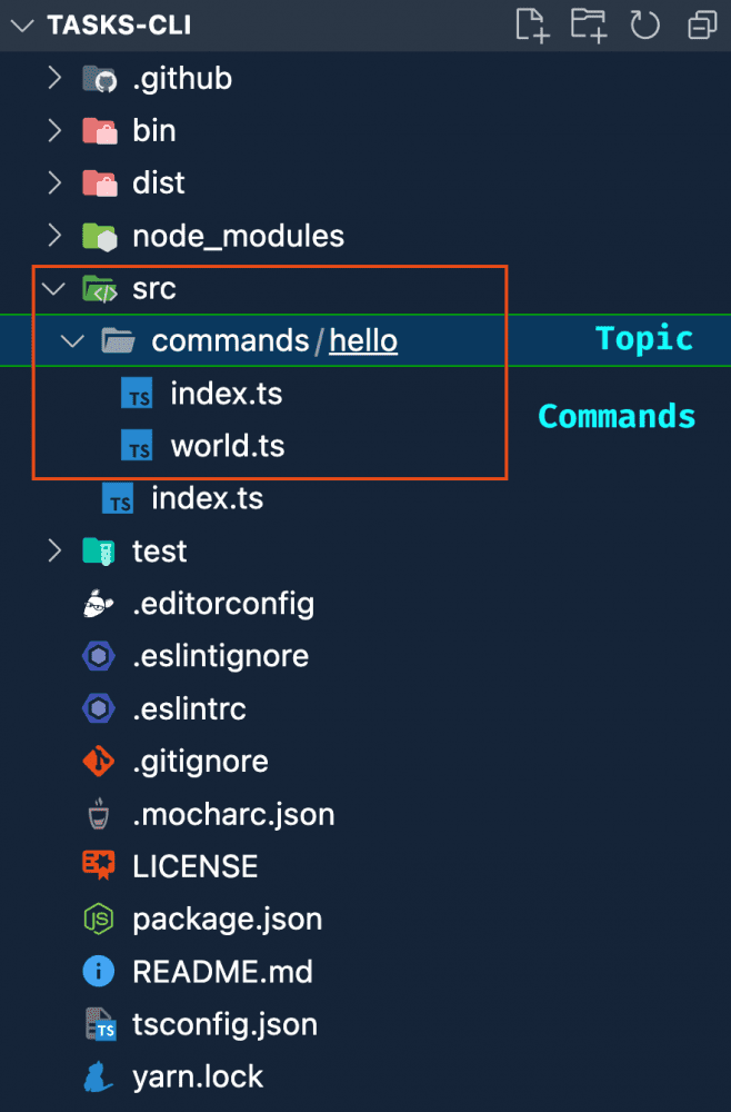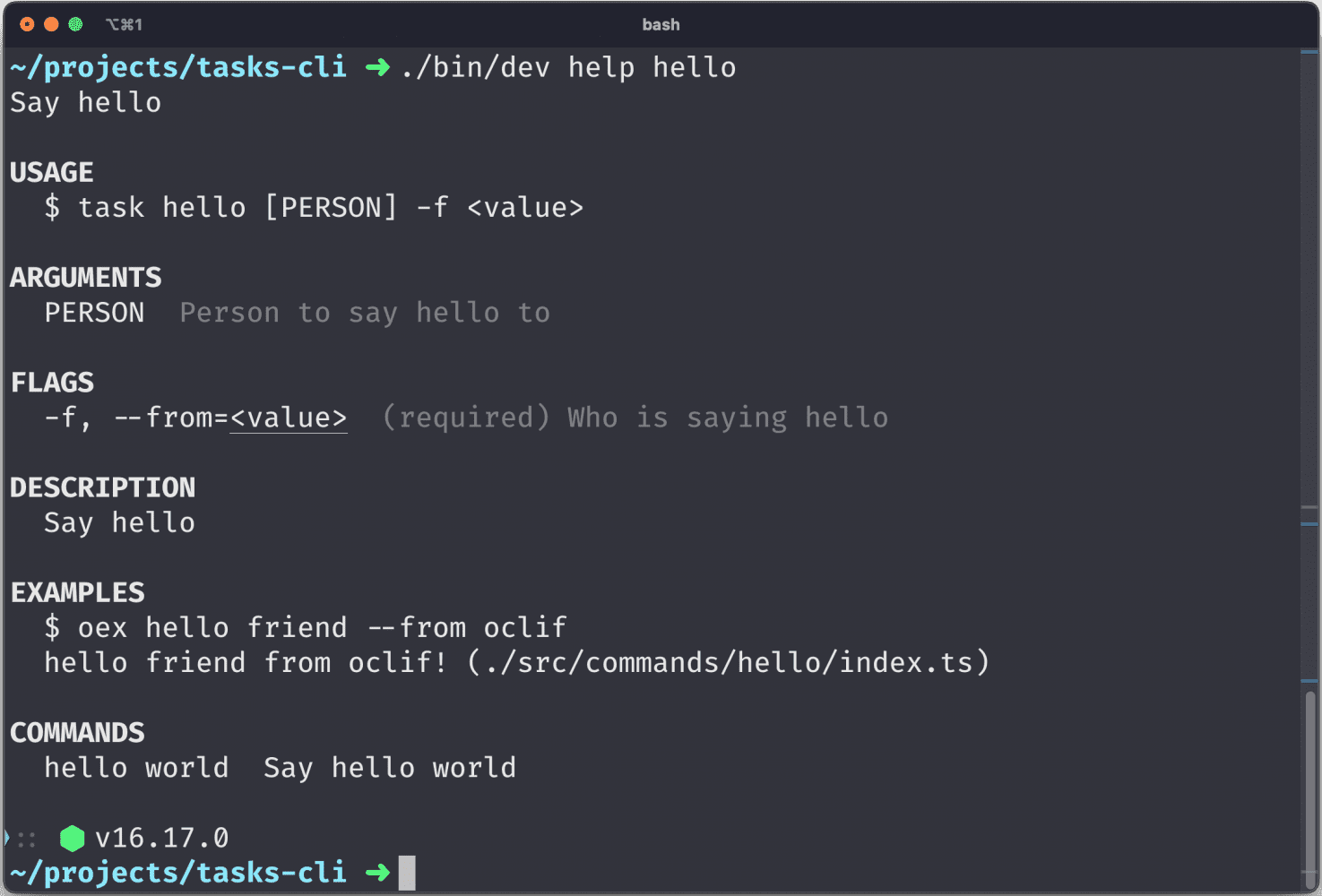 Para el proyecto tasks-cli , no necesitamos el tema hello ; continúe y elimínelo, pero antes, eche un vistazo al código fuente commands/hello/index.ts y vea lo que hace. Si no lo entiende, está bien, exploraremos la estructura de un comando oclife en la siguiente sección.