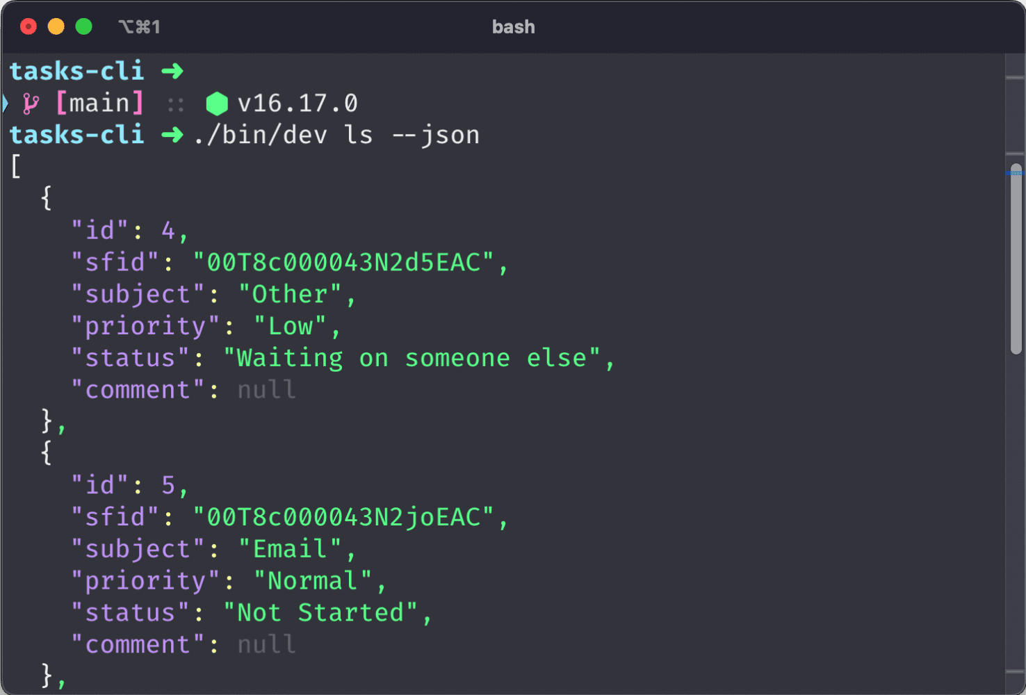 <dx-code-block title language="typescript" code-block=" public static enableJsonFlag = true public async run(): Promise { const {flags} = await this.parse(TasksList) const tasks = this.#db.listTasks() CliUx.ux.table(tasks, { id: { header: ‘ID’, extended: true, }, subject: {}, priority: {}, status: {}, comment: { extended: true, }, sfid: { header: ‘Synced’, get: (row: Task) => row.sfid ? `Yes (${row.sfid})` : ‘No’, extended: true, }, }, { printLine: this.log.bind(this), …flags, }) return tasks } «>