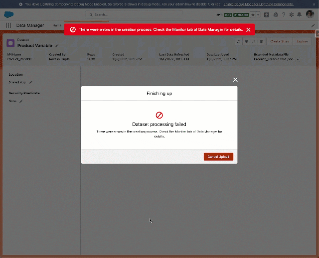 - BOOM, recibimos el mensaje de error 😭 “ Hubo errores en el proceso de creación. Consulte la pestaña Supervisar del Administrador de datos para obtener más información. “