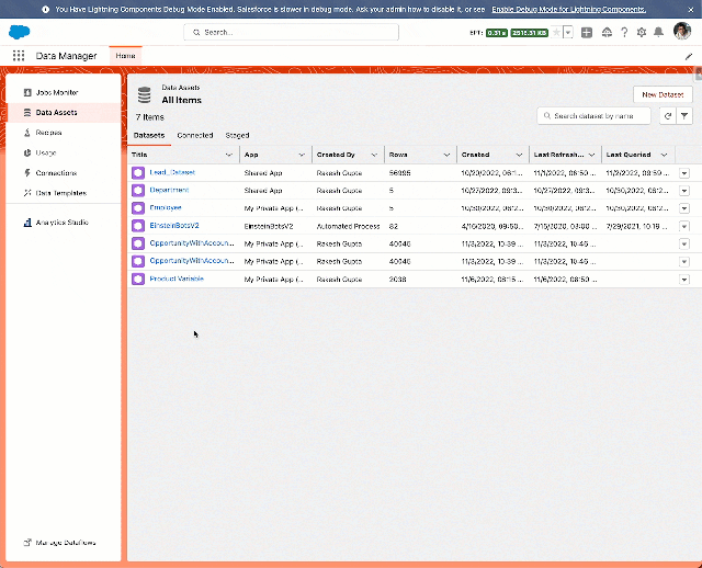 Un conjunto de datos es un conjunto de datos de origen especialmente formateados y optimizados para la exploración interactiva. t organiza los datos por columnas y filas. CRM Analytics permite a los usuarios almacenar datos de múltiples fuentes: