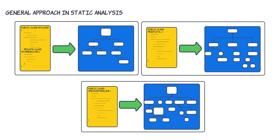 Muchas herramientas de análisis estático identifican el código problemático al convertir cada archivo o clase a su formato de árbol de sintaxis abstracta (AST) y analizarlo. En pocas palabras, un AST es una representación de código en sus bloques básicos, organizados en un formato jerárquico. Para detectar un problema, como una variable local no utilizada, la herramienta de análisis estático examina la jerarquía del código, verifica que cada variable local tenga una invocación y crea una infracción cuando no se encuentra la invocación.