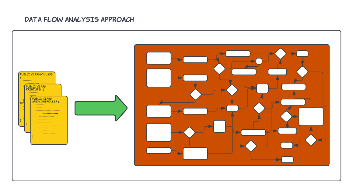 ¿Acabo de escuchar a algunos entusiastas de las ciencias de la computación vitoreando? Bueno, tiene todas las razones para hacerlo porque el análisis de flujo de datos (DFA) es una técnica que complementa el enfoque general de AST y captura escenarios más complejos. DFA consume todo el código fuente simultáneamente y asimila esta información para producir una mejor comprensión de lo que sucede en el código. Como parte de esta asimilación, DFA desglosa el flujo de control del código y crea rutas que abarcan condicionales, instancias de clases y muchos niveles de invocaciones de métodos y llamadas estáticas. En cada punto de cada ruta, DFA intenta predecir el valor de las variables y campos involucrados.