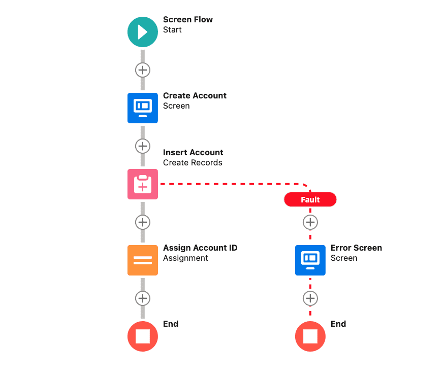 El siguiente diagrama muestra un flujo de ejemplo para el objeto Cuenta. Hemos llamado a este flujo "Crear_Cuenta".