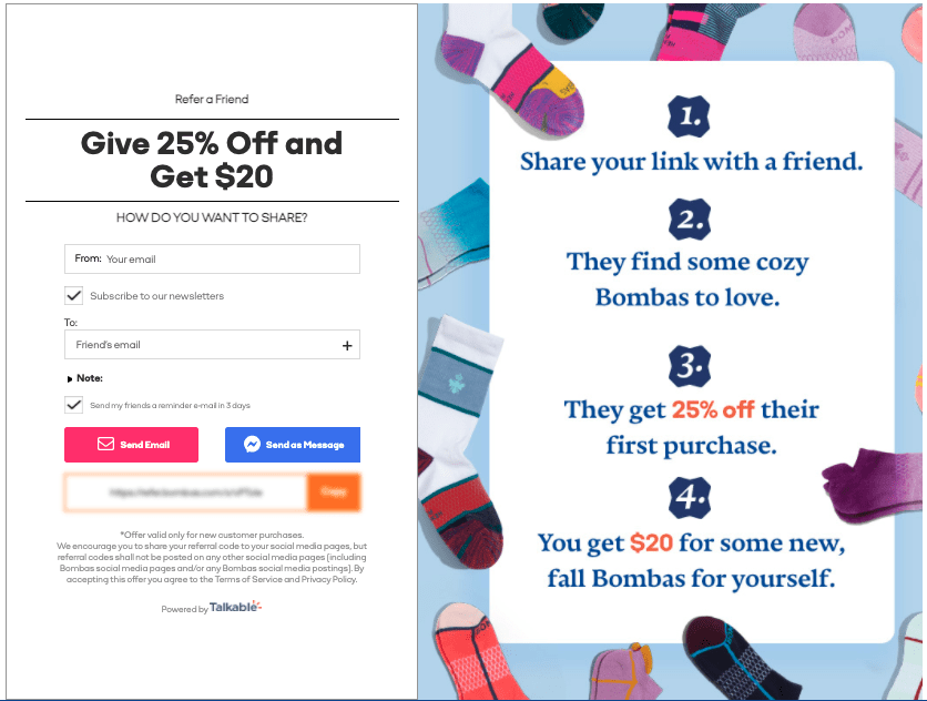 Por ejemplo, Bombas ofrece un incentivo por recomendar a un amigo donde ambos se benefician. Tu amigo obtiene un descuento y tú obtienes crédito para la tienda.