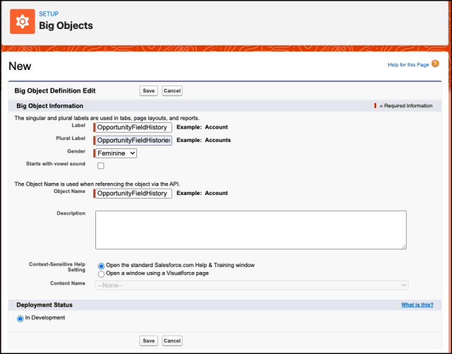 - De forma predeterminada, un Big Object se crea con En desarrollo – Estado de implementación. Para implementar un Big Object, tenemos que crear campos personalizados y una tabla de índice.