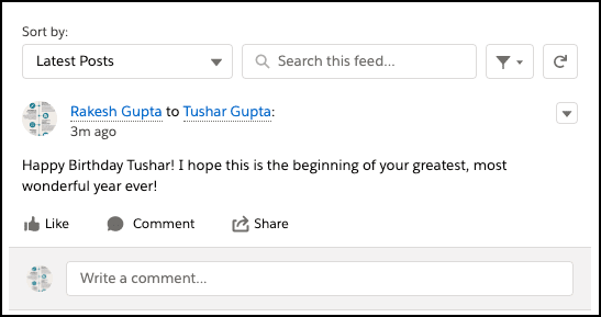 A partir de ahora, si un usuario crea un registro en el objeto Programar publicación de Chatter , Salesforce Flow publicará automáticamente el mensaje en Chatter según el campo Fecha de publicación .