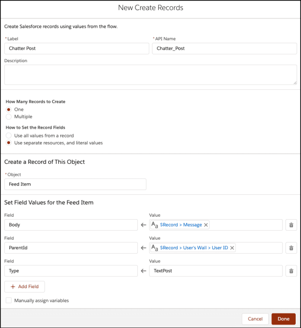 Paso 2.3 Flujo de Salesforce: agregar un elemento Crear registros para insertar un registro en el objeto FeedItem