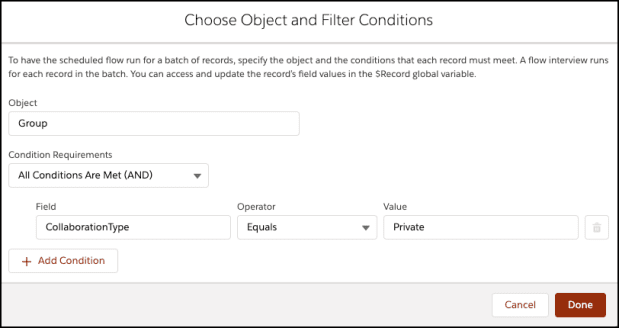 - Utilice el flujo activado por programación para comprobar si hay solicitudes de grupos de Chatter pendientes