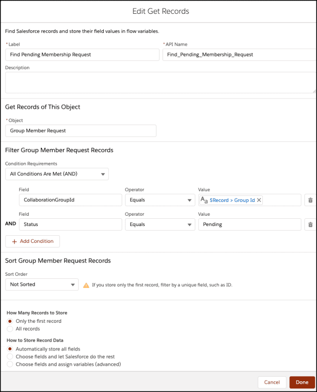 El elemento Obtener registros verificará si existen solicitudes de membresía pendientes para un grupo privado de Chatter.