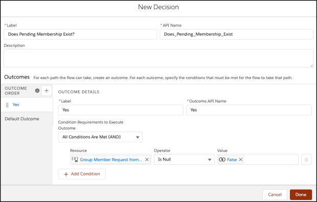 - Agregue un elemento de decisión para verificar si existe una solicitud de membresía pendiente