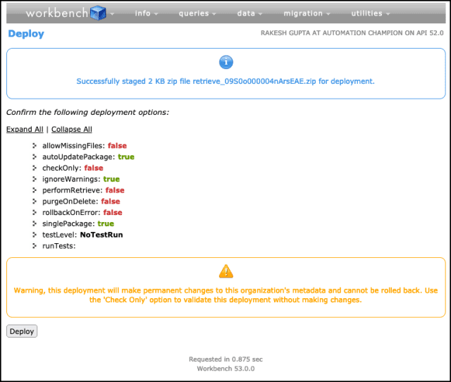 Siga las instrucciones para crear un paquete e implementarlo en otra organización de Salesforce utilizando Workbench .
