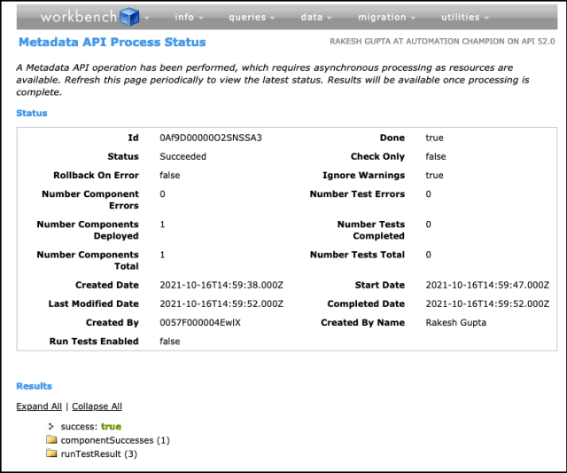 Hoy, voy a discutir cómo implementar un Proceso (s) o Flujo (s) usando el Workbench . Workbench es un poderoso conjunto de herramientas basado en la web diseñado para que los administradores y desarrolladores interactúen con las organizaciones de Salesforce.com a través de las API de Force.com. Workbench permite a los usuarios describir, consultar, manipular y migrar datos y metadatos en las organizaciones de Salesforce.com directamente en su navegador web con una interfaz de usuario simple e intuitiva. Workbench es de uso gratuito, pero no es un producto oficial de Salesforce.com.