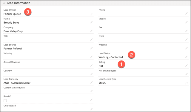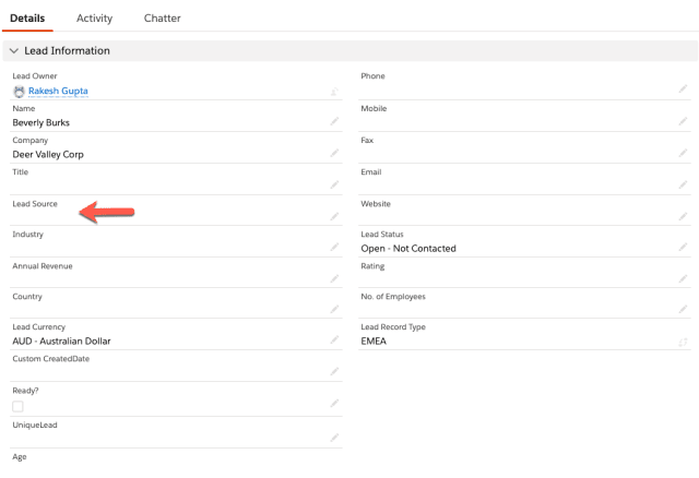 -  Actualmente, el líder Beverly Burks está abierto y la fuente del cliente potencial está en blanco, como se muestra en la siguiente captura de pantalla:
