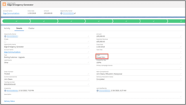 - Ahora intentaremos actualizar la etapa "Edge Emergency Generator" de la oportunidad a Cerrada ganada.
