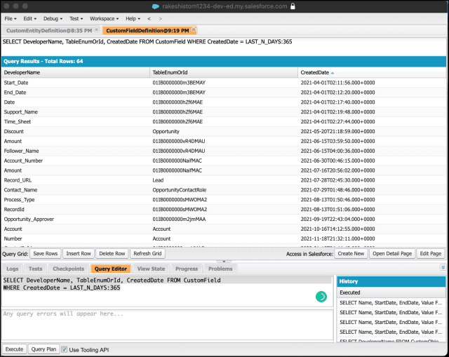 Para encontrar los campos personalizados creados en los últimos 365 días, usaremos Developer Console para consultar el objeto CustomField de la API de herramientas.