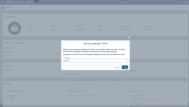 - Reduzca los gastos generales de administración con un solo bot y un modelo de NLP que habla varios idiomas : – Acelere la expansión de bots con bots multilingües de Einstein. Ahora, con un solo bot que incluye traducciones en varios idiomas, reduzca los gastos generales de administración al permitir que los administradores mantengan un solo bot y modelo NLP, en lugar de uno por idioma.