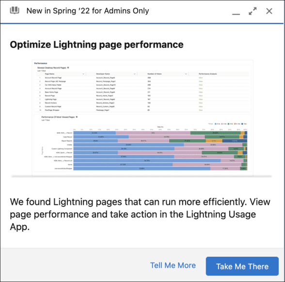 - Si está trabajando en Lightning App Builder y tiene páginas de registro de escritorio lentas, un aviso único lo dirige a la tabla de aplicación Lightning Usage.