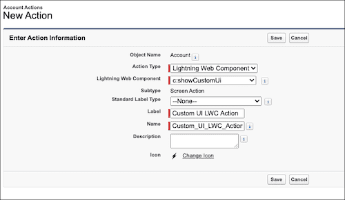 - Cree una acción de componente web Lightning (piloto) : – Cree un componente web Lightning (LWC) y utilícelo como una acción rápida. Las acciones del componente web Lightning funcionan en paralelo en sus páginas junto con el componente Lightning y las acciones de Visualforce. Las acciones de LWC ofrecen ventajas como la capacidad de personalizar fácilmente encabezados y pies de página y crear acciones que no tienen representación en la interfaz de usuario.