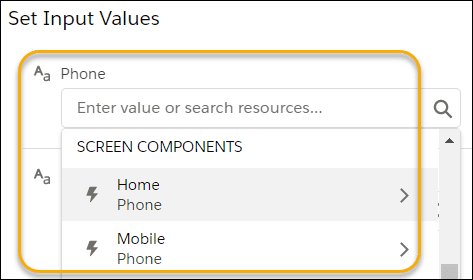 automaticOutputVariablesy los muestra como opciones de entrada para el campo Teléfono. En este caso, los campos de combinación son componentes de teléfono estándar para Hogar y Móvil.