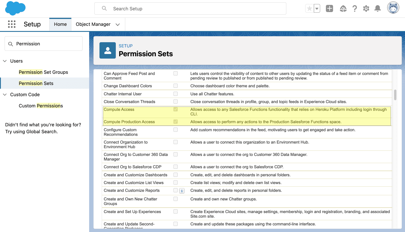 Por ejemplo, es posible que desee considerar la posibilidad de crear Functions Developers y Functions Administrator (o actualizar los perfiles existentes o los conjuntos de permisos que tenga). Estos nuevos permisos le permiten distinguir entre desarrolladores que pueden programar funciones y administradores que pueden implementar funciones en el espacio de producción pero que no tienen permisos completos de administrador del sistema de Salesforce.