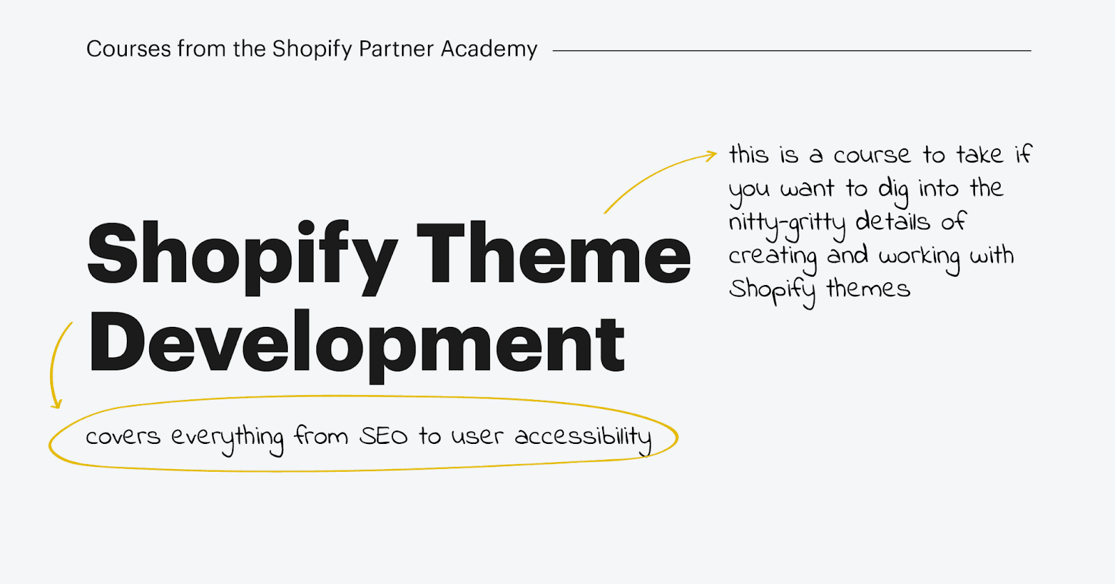 Desarrollo de temas de Shopify. Este es un curso que debe tomar si desea profundizar en los detalles esenciales de la creación y el trabajo con temas de Shopify. Cubre todo, desde SEO hasta la accesibilidad del usuario. Debido a que Shopify ofrece temas de arrastrar y soltar para principiantes, no es necesario aprender esto solo para usar la plataforma, pero puede ser útil para los dueños de negocios que necesitan habilidades más avanzadas para manejar su propio tema.