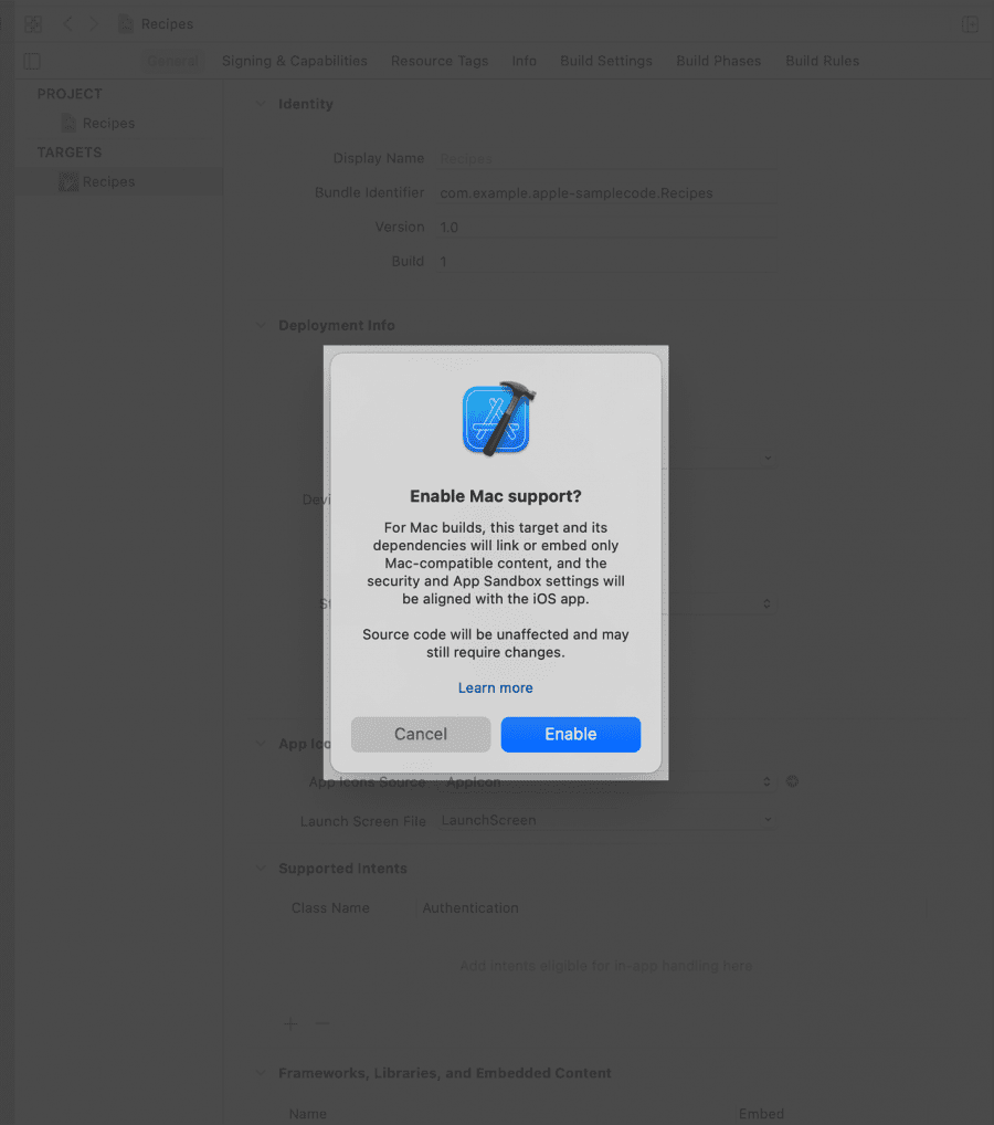 Para comenzar, simplemente haga clic en la casilla de verificación de Mac en la configuración del proyecto de la aplicación de su iPad para configurar el proyecto para crear versiones de su aplicación para Mac y iPad. Las dos aplicaciones comparten el mismo proyecto y código fuente, lo que facilita el cambio de código en un solo lugar. Consulte Encender Mac Catalyst para obtener más detalles.