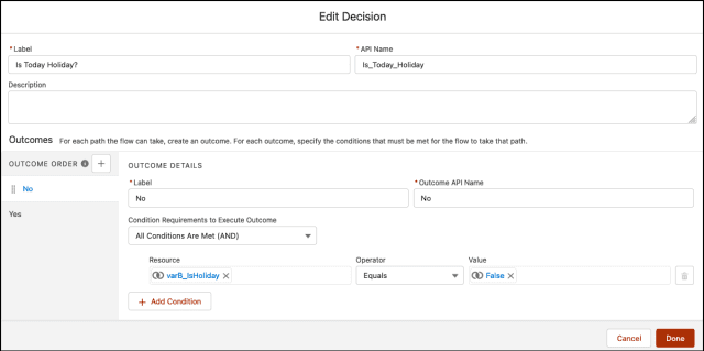 Paso 3.4: Flujo de Salesforce: uso del elemento de decisión para verificar si la fecha/hora dadas son días festivos